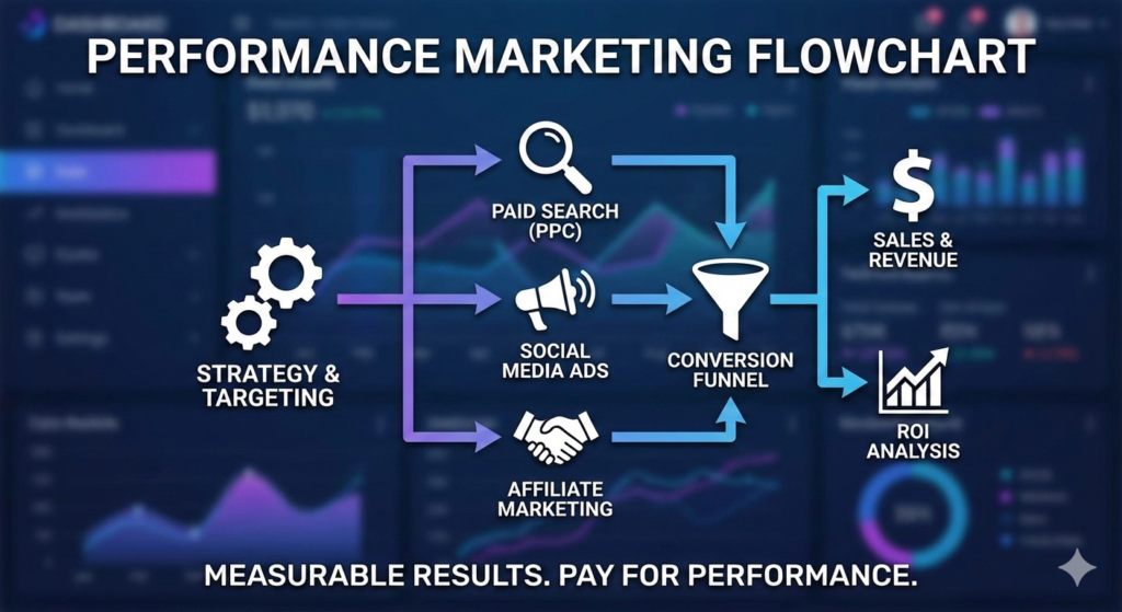 Performance marketing is a digital marketing strategy that turns ads into measurable business results. It ensures businesses spend their marketing budget only on what actually works.